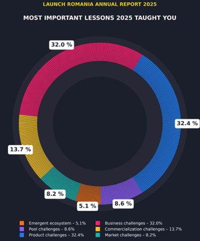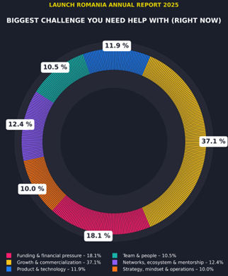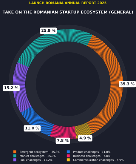 Founders describe Romania’s startup landscape as an emergent ecosystem (35.3%). The main frictions they point to are market challenges (25.9%) and pool challenges — access to talent/partners/capital (15.2%). Company-level issues appear less often: product (11.0%), business (7.8%), commercialization (4.9%).
