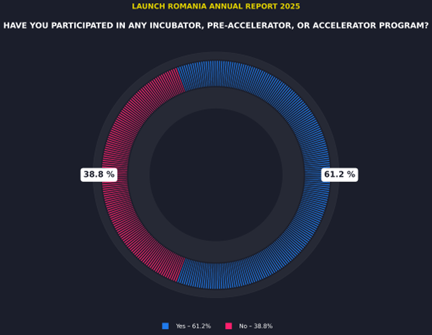In 2025, 61.2% of founders say they’ve participated in an incubator, pre-accelerator, or accelerator, while 38.8% have not.