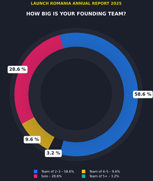 In 2025, most teams are 2–3 founders (58.6%), followed by solo founders (28.6%), then 4–5 (9.6%) and 5+ (3.2%).