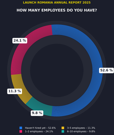 In 2025: 52.6% of startups haven’t hired yet. Among those with employees, 24.1% have 1–2, 11.3% have 3–5, and 9.8% have 6–10.