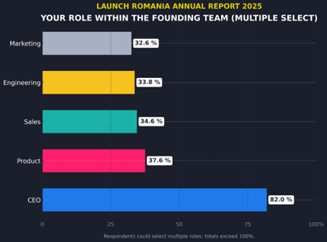Most survey responses come from CEOs (82.0%). Founders also report wearing multiple functional hats: Product (37.6%), Sales (34.6%), Engineering (33.8%), and Marketing (32.6%). These shares reflect multi-role founders and won’t sum to 100%.